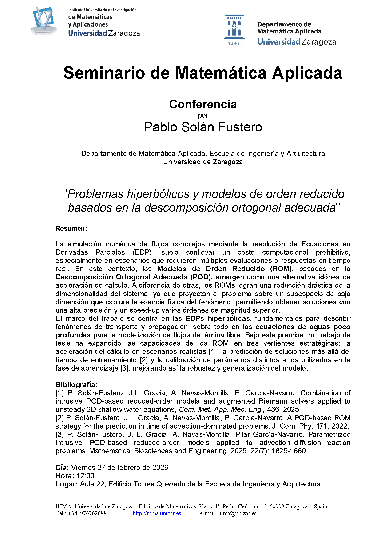 Pablo Solán Fustero (Universidad de Zaragoza) impartirá la conferencia "Problemas hiperbólicos y modelos de orden reducido basados en la descomposición ortogonal adecuada"